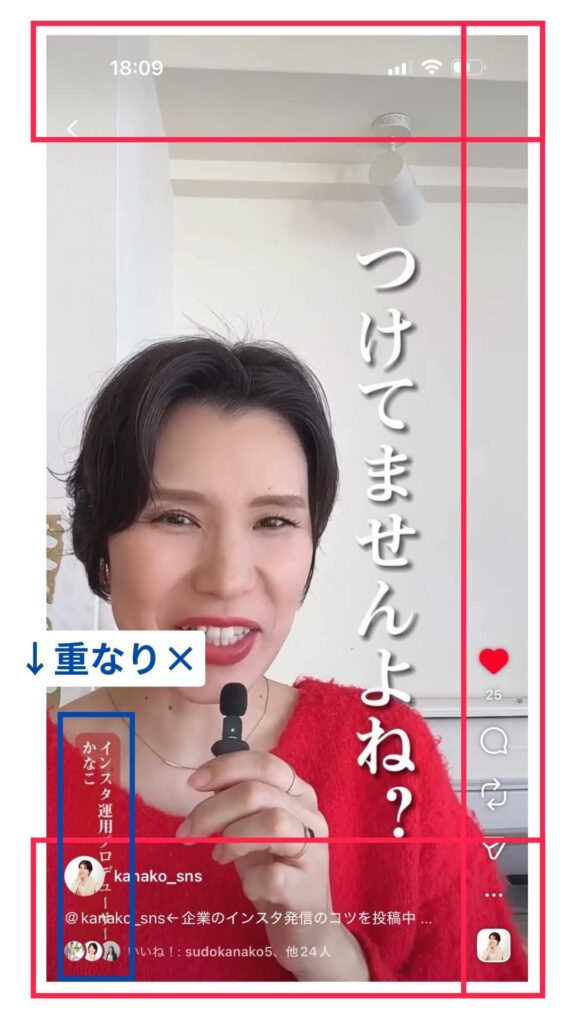 リールは上下左右にUI(ボタンやアイコン)が表示されます。安全に文字を配置できるエリアは、画面の中央部分です。
